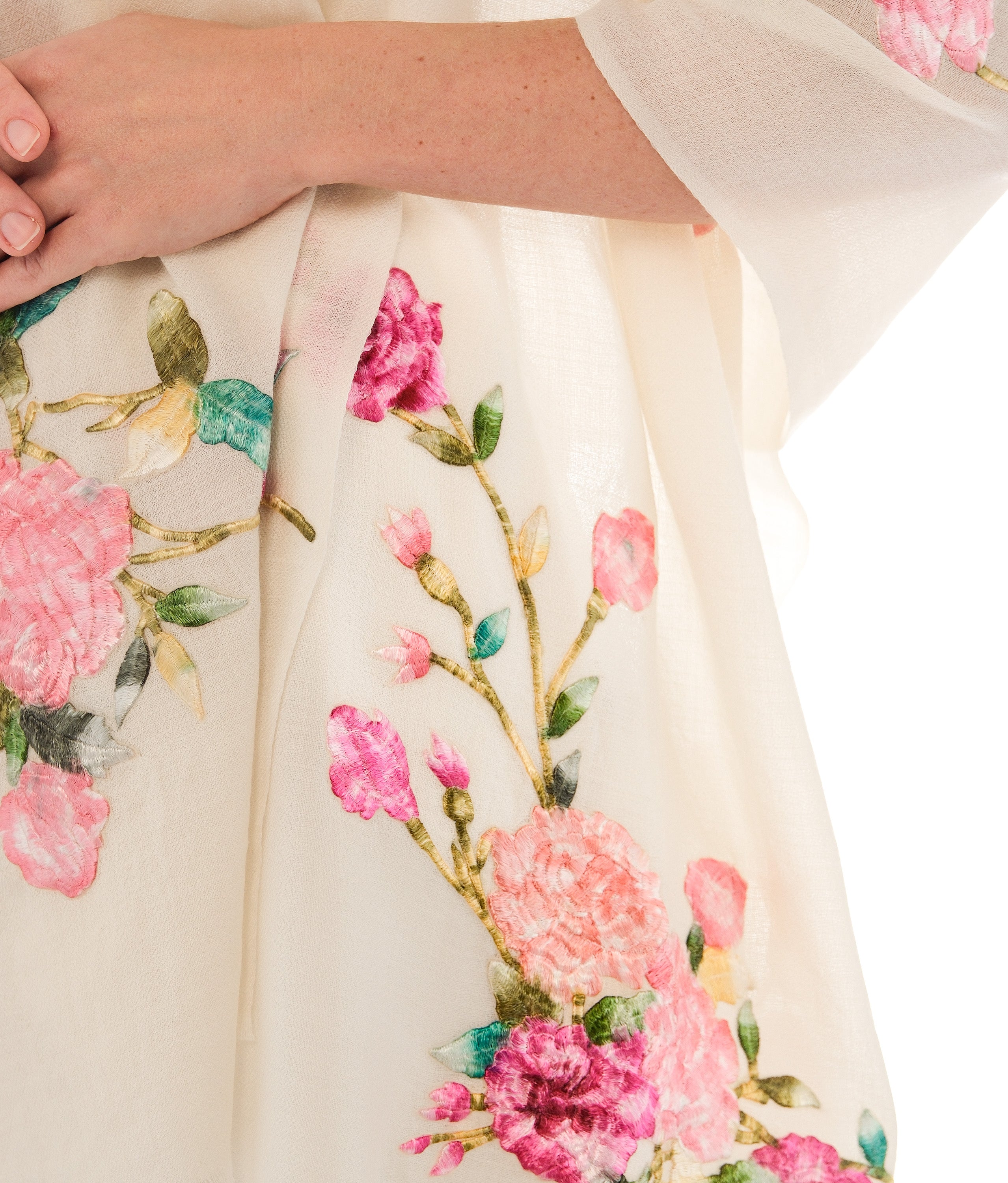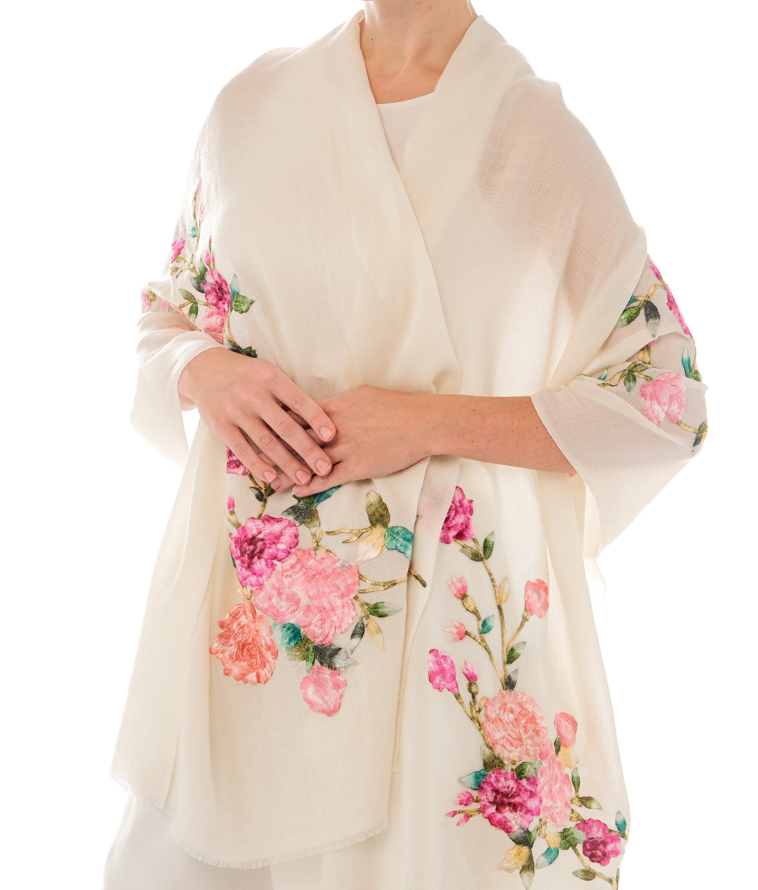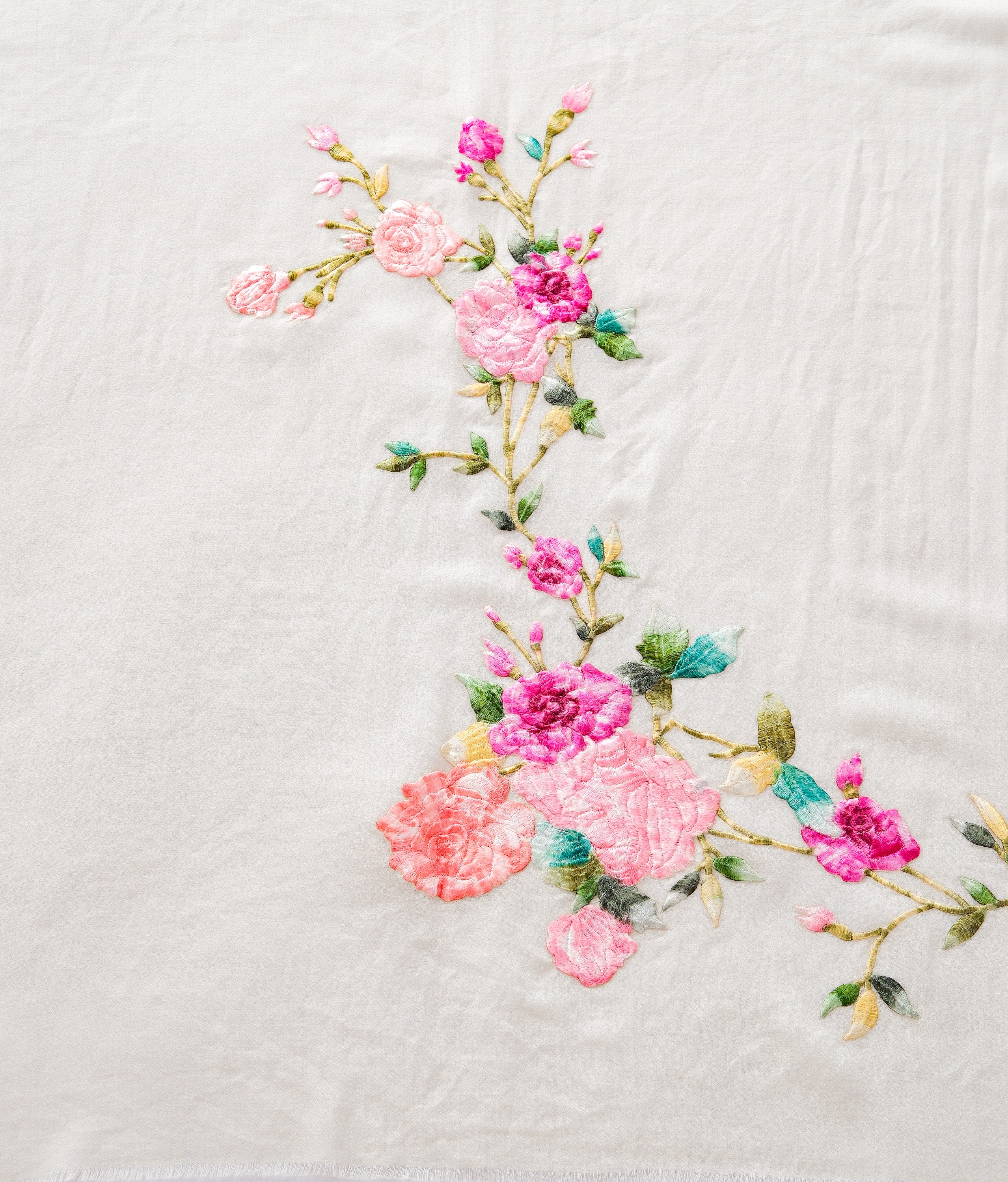 Floral Embroidered Shawl, a perfect blend of elegance and comfort. Crafted from a soft, lightweight fabric, this shawl features a beautiful cream base adorned with vibrant floral embroidery in shades of pink, fuchsia, and green. The intricate floral designs add a touch of femininity and sophistication, making it an ideal accessory for any occasion.